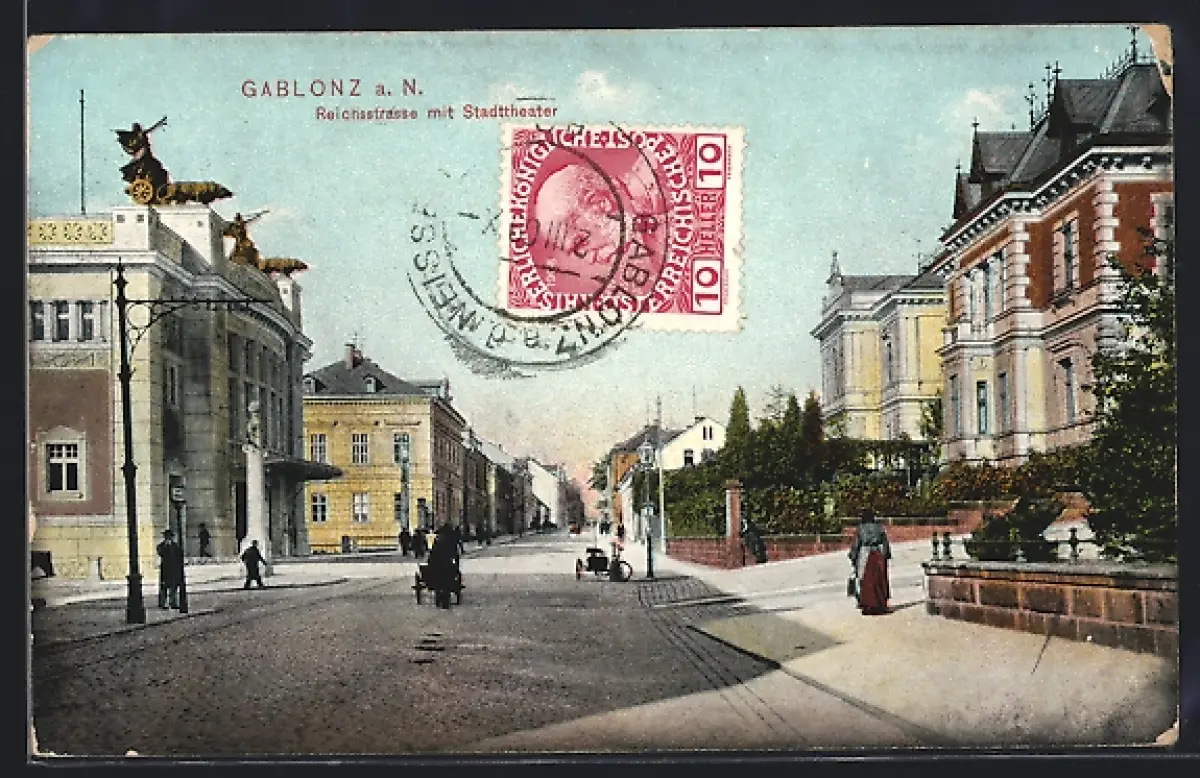 AK Gablonz a. N., Reichsstrasse mit Stadttheater