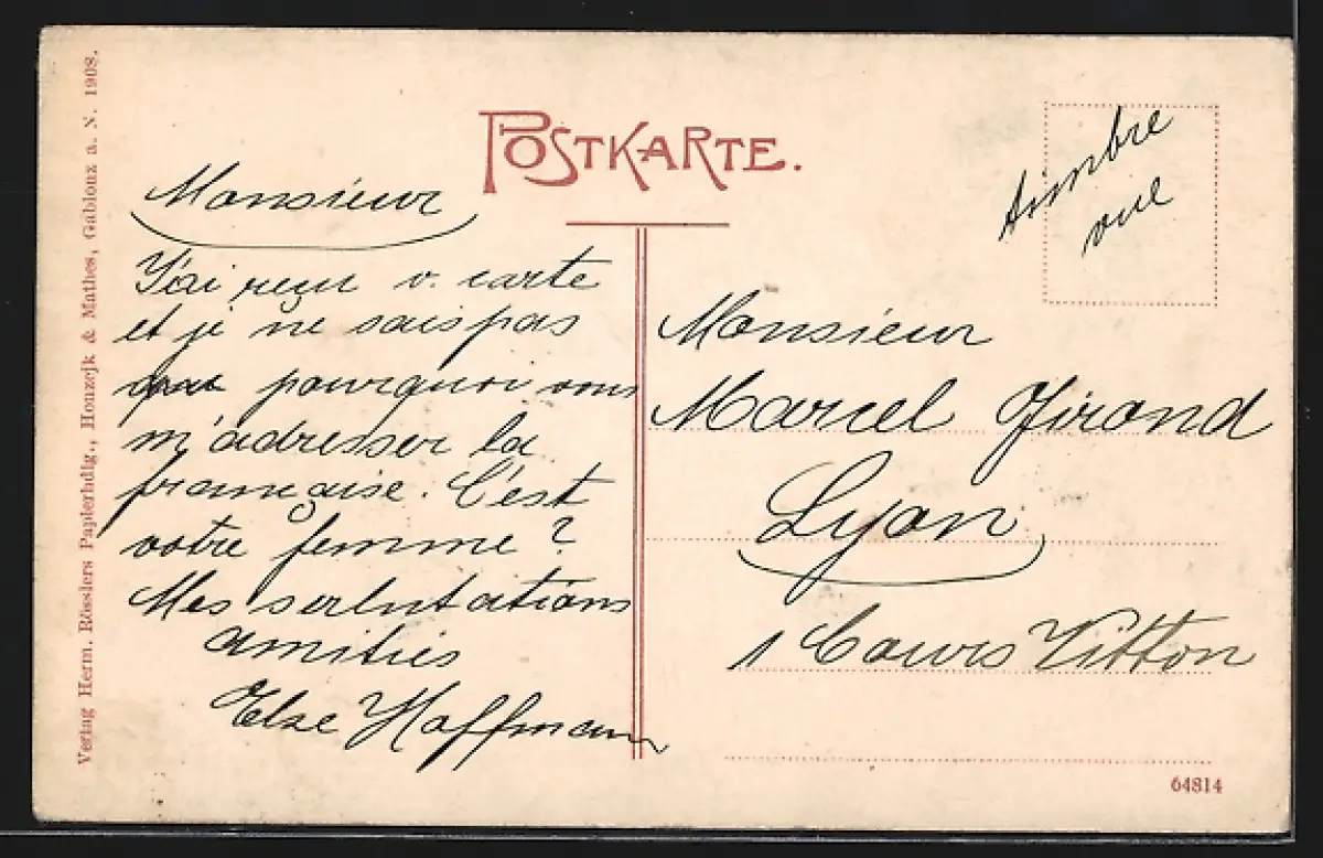 Personenbezogene Daten auf der Rückseite der Karte wurden durch blauen Textmarker unkenntlich gemacht. Die blauen Stellen sind auf die Vorderseite durchgeweicht und wirken sich negativ auf das Postkartenfoto aus