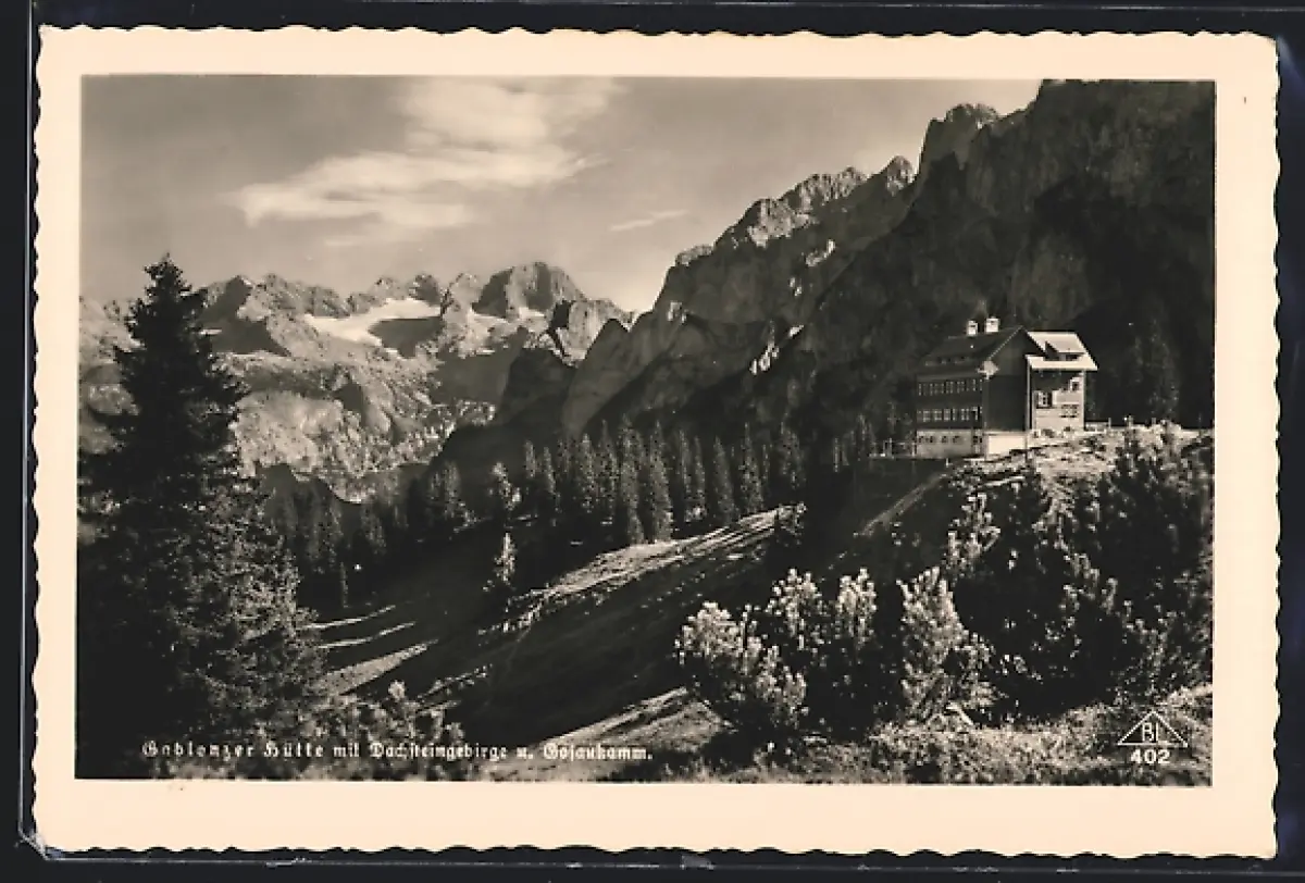 AK Gablonzer-Hütte Dachsteinblick, Berghütte mit Dachsteingebirge und Gosaukamm