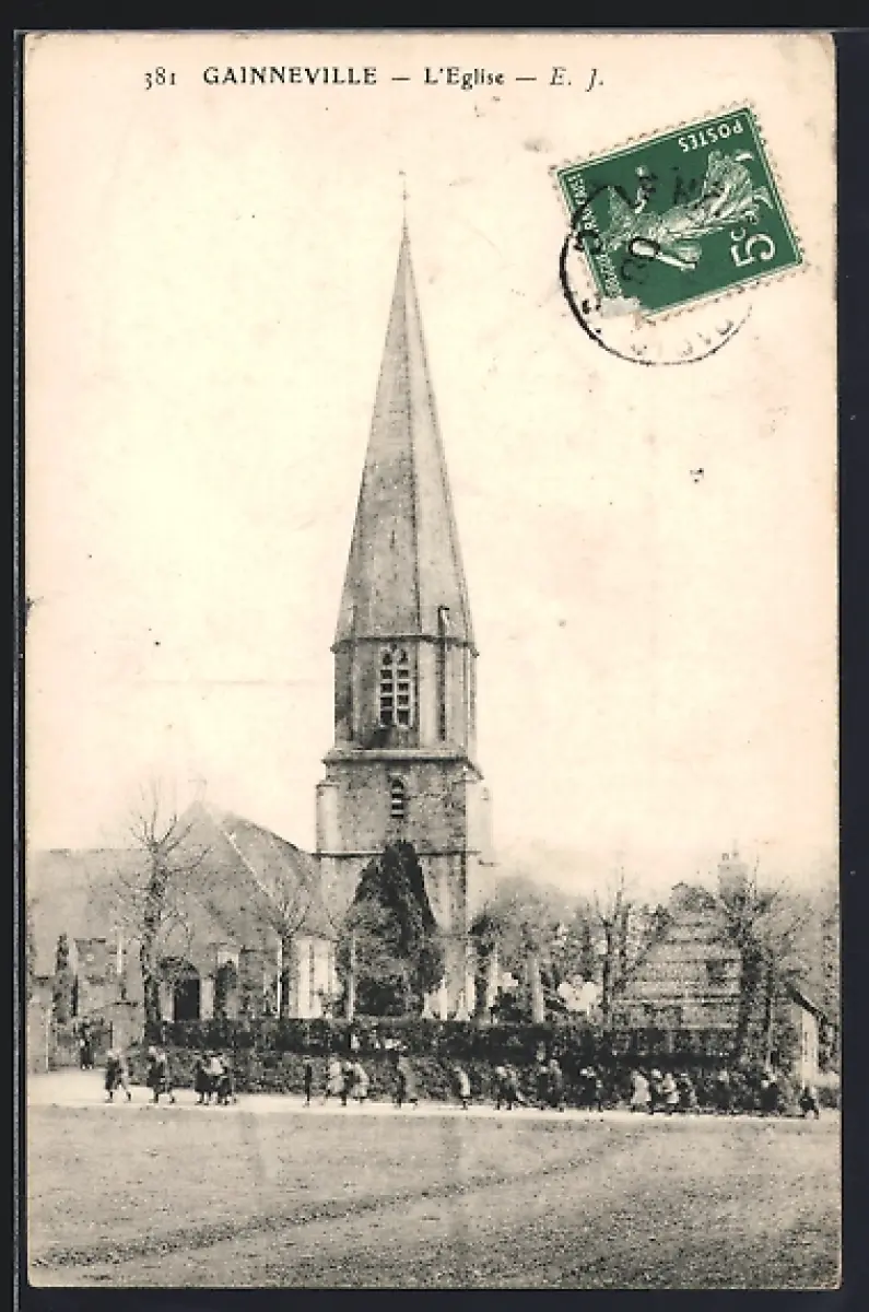 AK Gainneville, L`Église avec la foule rassemblée devant