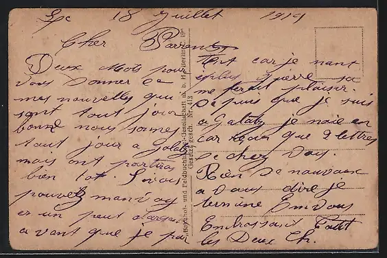 Personenbezogene Daten auf der Rückseite der Karte wurden durch blauen Textmarker unkenntlich gemacht. Die blauen Stellen sind auf die Vorderseite durchgeweicht und wirken sich negativ auf das Postkartenfoto aus