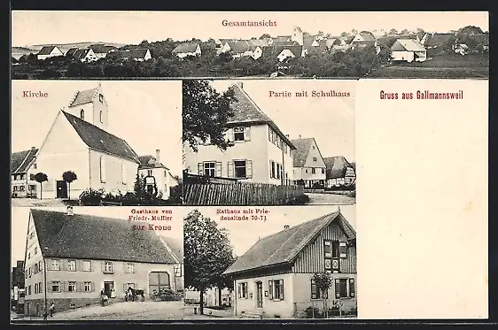 AK Gallmannsweil, Gasthaus zur Krone von F. Muffler, Rathaus mit Friedenslinde, Kirche