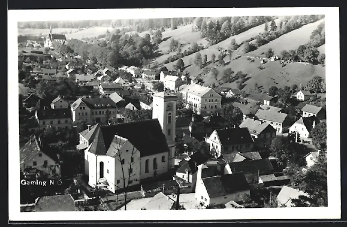 AK Gaming /N.Ö., Ortsansicht mit Kirche aus der Vogelschau