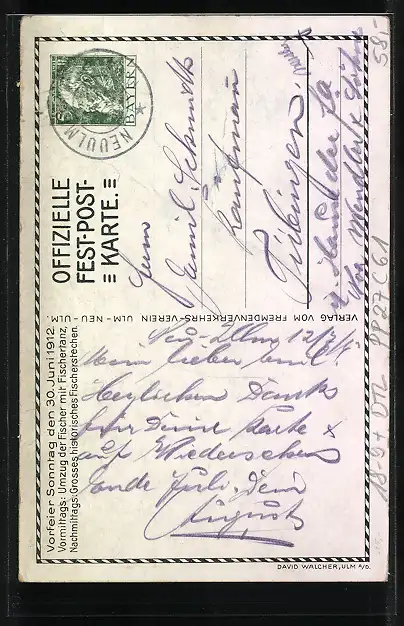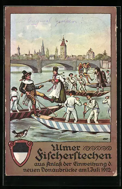 AK Ganzsache Bayern PP27C61: Ulm a. D., Ulmer Fischerstechen zur Einweihung d. neuen Donaubrücke 1912