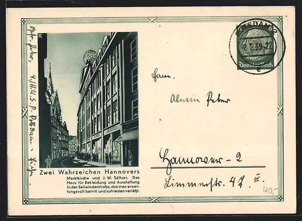 AK Ganzsache PP127B6 /04: Hannover, Marktkirche und Geschäft J. W. Sältzer in der Seilwinderstrasse