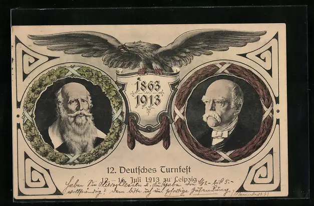 AK Ganzsache PP27C195: Leipzig, 12. Deutsches Turnfest 1913, Bismarck, Turnvater Jahn