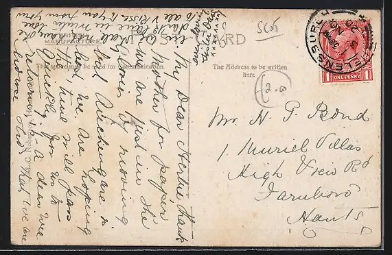 Personenbezogene Daten auf der Rückseite der Karte wurden durch blauen Textmarker unkenntlich gemacht. Die blauen Stellen sind auf die Vorderseite durchgeweicht und wirken sich negativ auf das Postkartenfoto aus