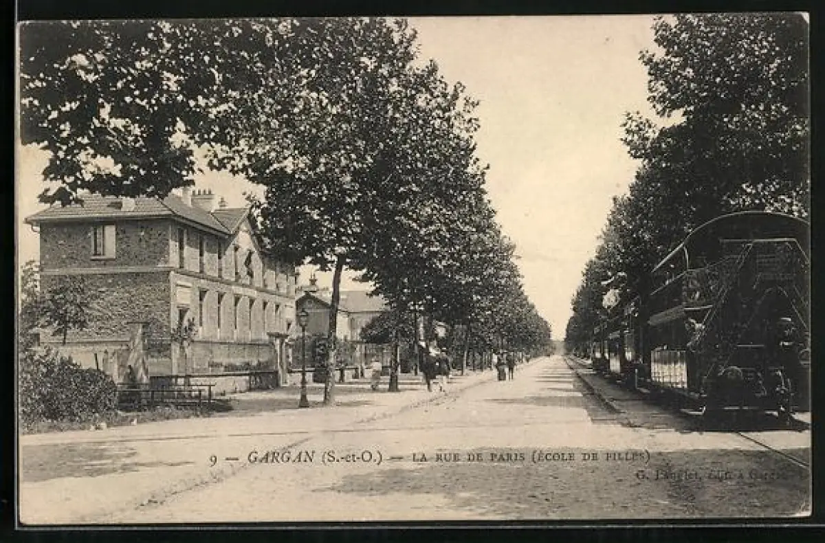 AK Gargan, La rue de Paris, Ecole des Filles, Strassenpartie mit Strassenbahn