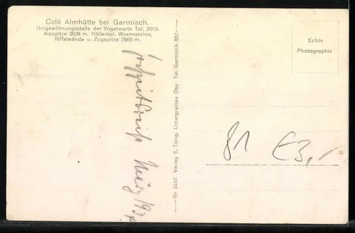Personenbezogene Daten auf der Rückseite der Karte wurden durch blauen Textmarker unkenntlich gemacht. Die blauen Stellen sind auf die Vorderseite durchgeweicht und wirken sich negativ auf das Postkartenfoto aus