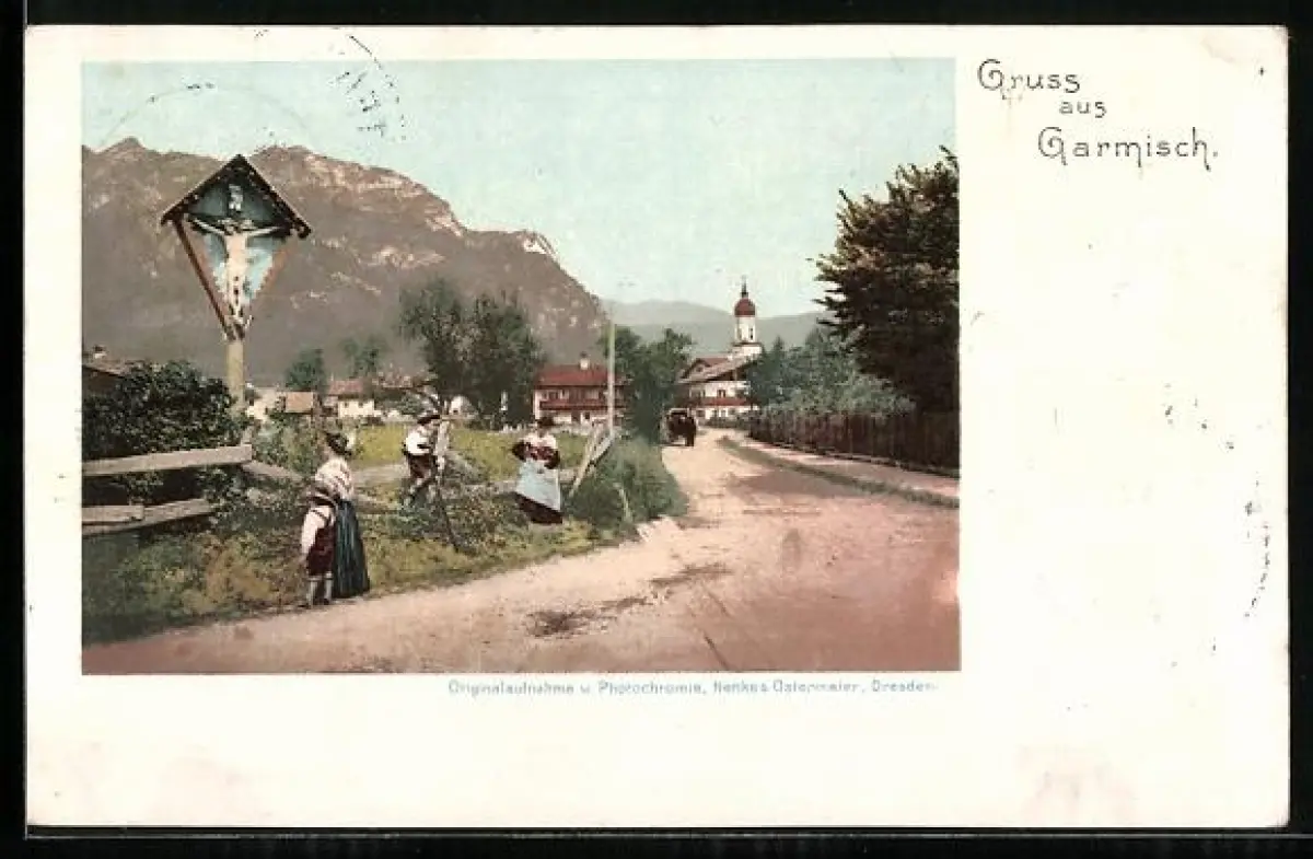 AK Garmisch, Dorfstrasse mit Wegkreuz und Kirche