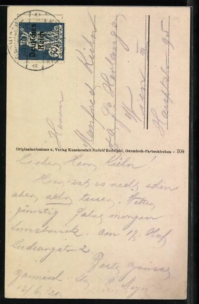 Personenbezogene Daten auf der Rückseite der Karte wurden durch blauen Textmarker unkenntlich gemacht. Die blauen Stellen sind auf die Vorderseite durchgeweicht und wirken sich negativ auf das Postkartenfoto aus