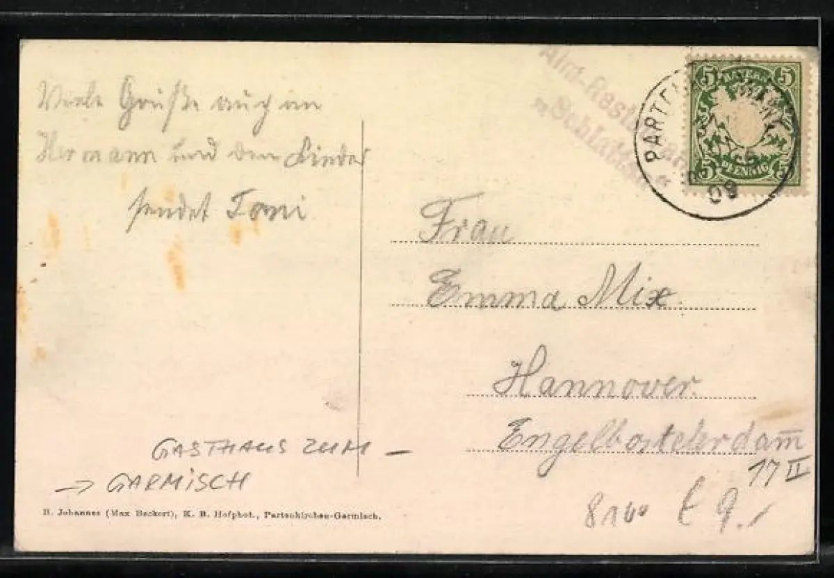 AK Garmisch, Gasthaus zum Schlattan vor Bergkulisse