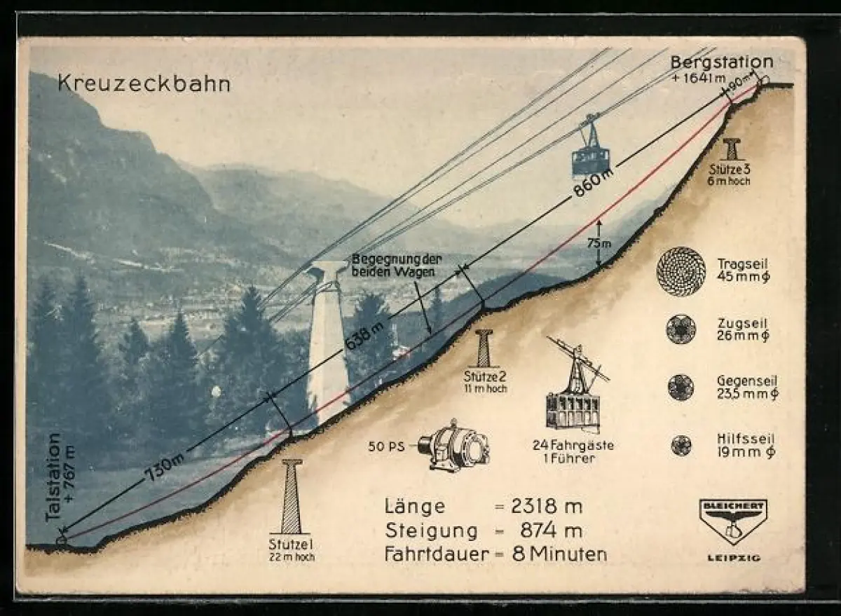 AK Garmisch, Kreuzeckbahn mit technischen Daten