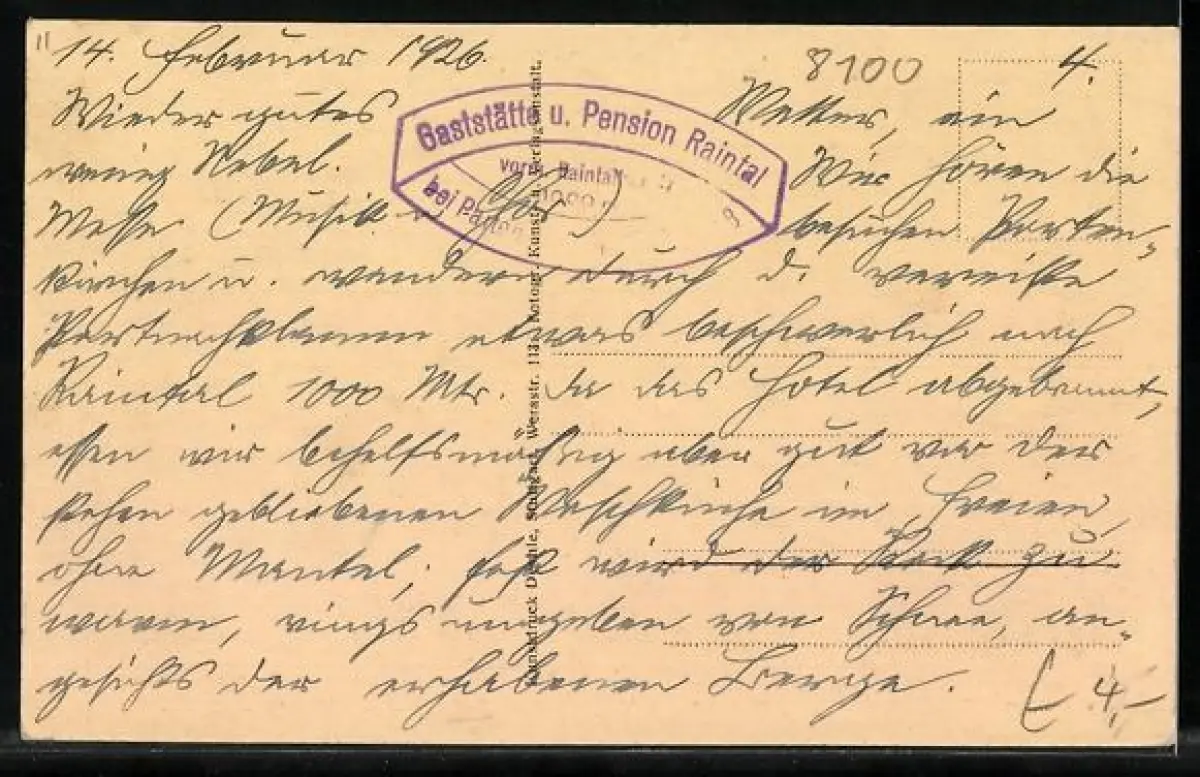 Personenbezogene Daten auf der Rückseite der Karte wurden durch blauen Textmarker unkenntlich gemacht. Die blauen Stellen sind auf die Vorderseite durchgeweicht und wirken sich negativ auf das Postkartenfoto aus