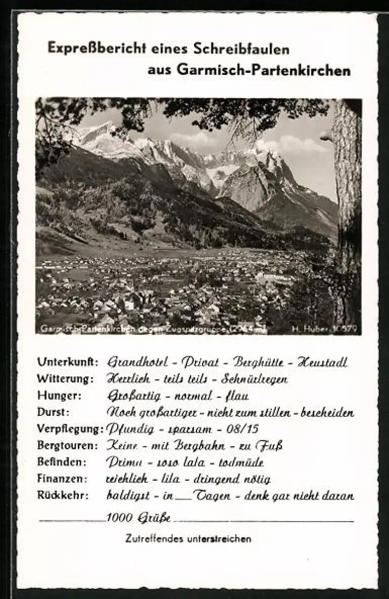 AK Garmisch-Partenkirchen, Ortsansicht gegen die Zugspitze, Expressbericht eines Schreibfaulen