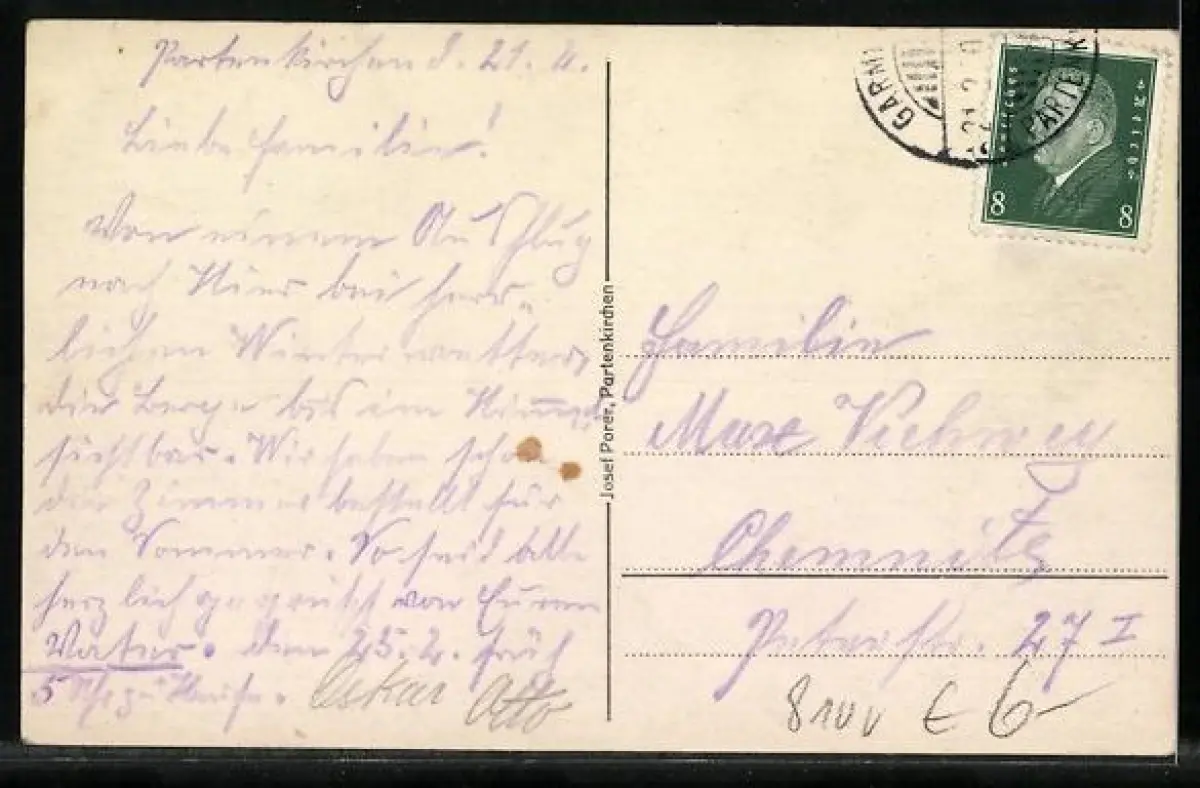 Personenbezogene Daten auf der Rückseite der Karte wurden durch blauen Textmarker unkenntlich gemacht. Die blauen Stellen sind auf die Vorderseite durchgeweicht und wirken sich negativ auf das Postkartenfoto aus