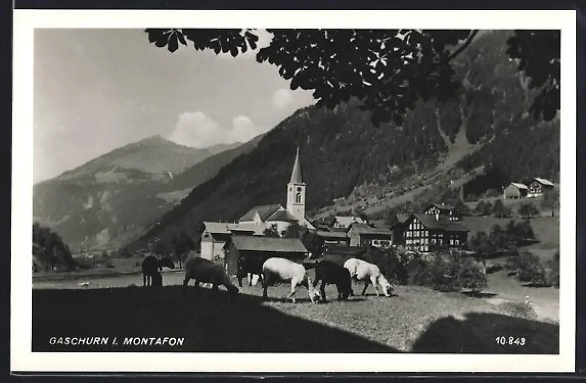 AK Gaschurn i. Montafon, Ortsansicht mit grasenden Schafen