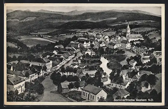 AK Gastern, Ortsansicht mit Kirche aus der Vogelschau