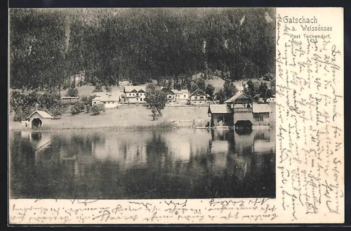 AK Gatschach a. Weissensee, Uferpanorama mit Bootshäusern