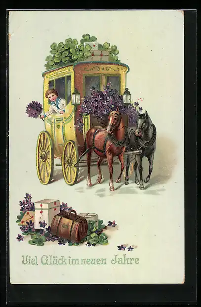 AK Geburtstag, Junge fährt in mit Blumen und Kleeblättern beladener Postkutsche