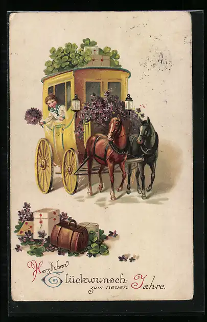AK Geburtstag, Junge fährt in mit Blumen und Kleeblättern beladener Postkutsche