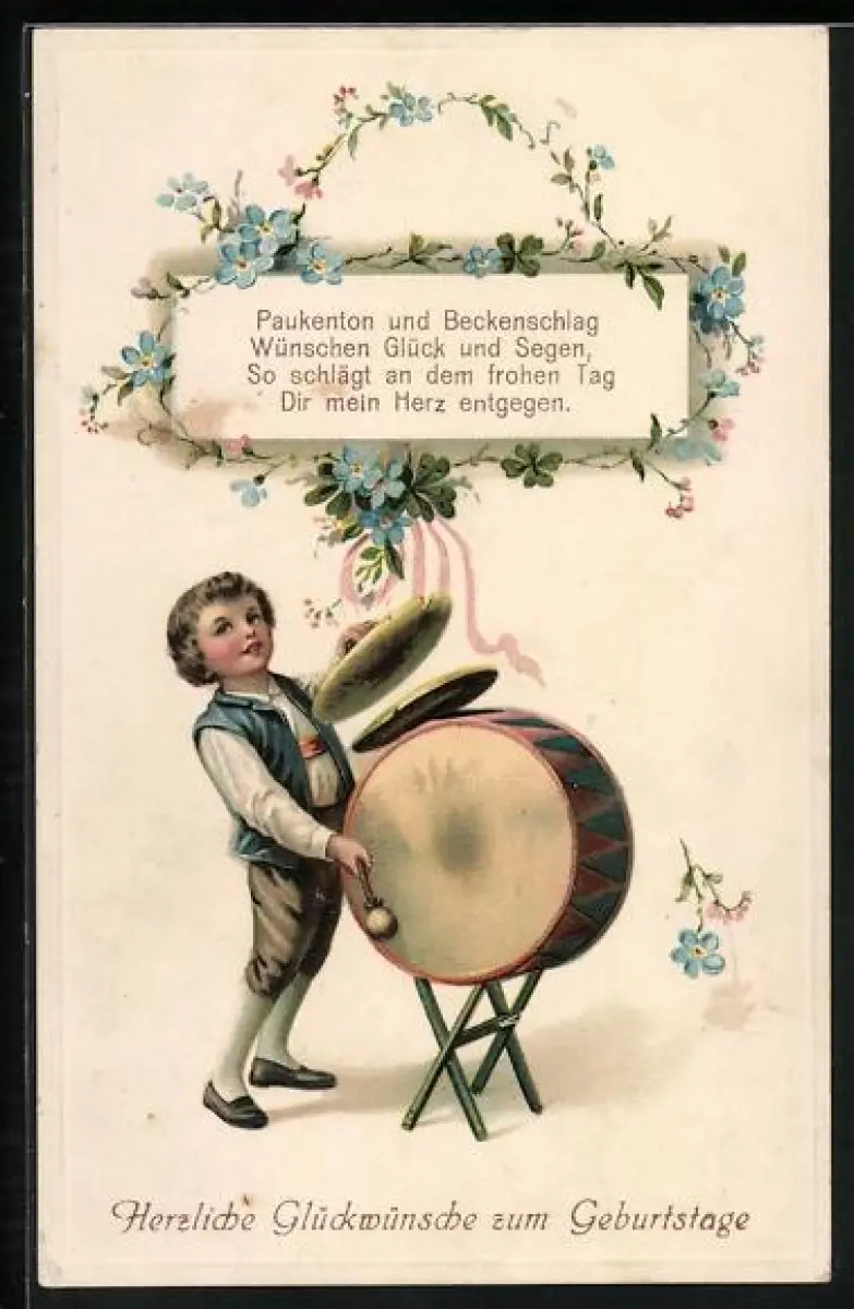 AK Geburtstag, Junge mit Pauke und Becken, Vergissmeinnicht
