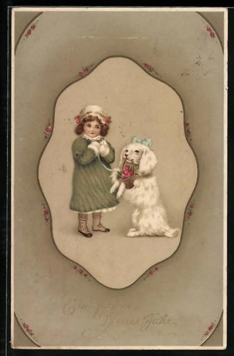 AK Geburtstag, Mädchen geht mit Terrier spazieren