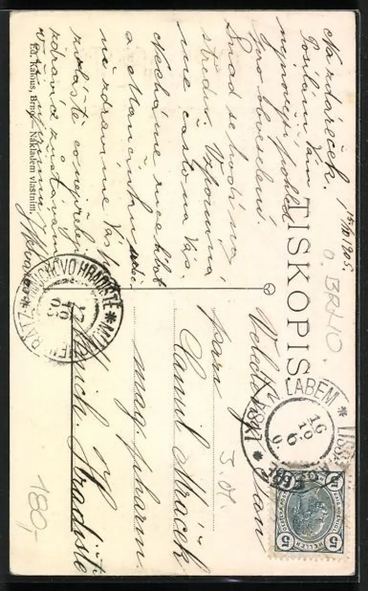 Personenbezogene Daten auf der Rückseite der Karte wurden durch blauen Textmarker unkenntlich gemacht. Die blauen Stellen sind auf die Vorderseite durchgeweicht und wirken sich negativ auf das Postkartenfoto aus