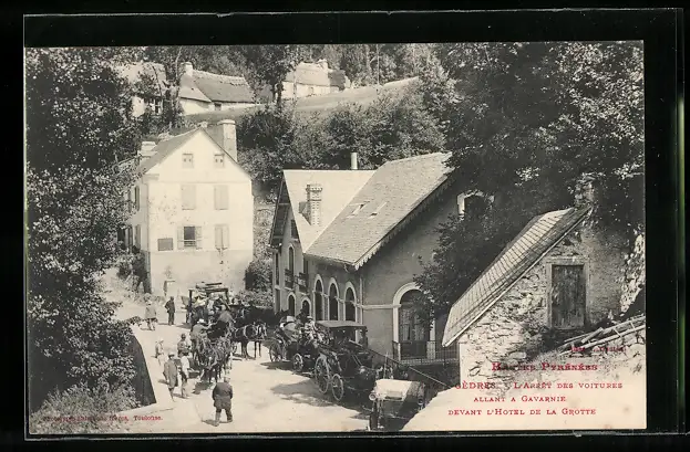 AK Gèdres, L`Arrêt des Voitures allant a Gavarnie devant l`Hotel de la Grotte