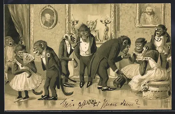 AK Gehobene Affengesellschaft in Abendgarnitur