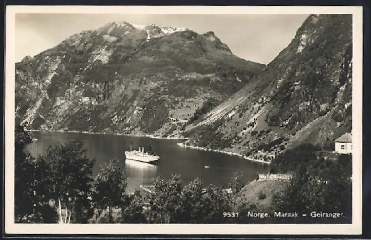 AK Geiranger, Maraak, Schiff ankert im Fjord, gewaltiges Bergpanorama
