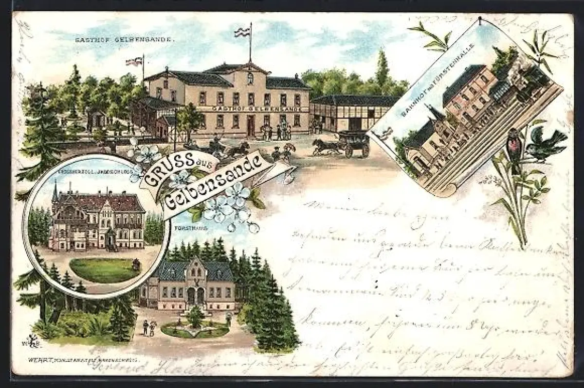 AK Gelbensande, Gasthof Gelbensande, Bahnhof mit Fürstenhalle, Grossherzogl. Jagdschloss, Forsthaus