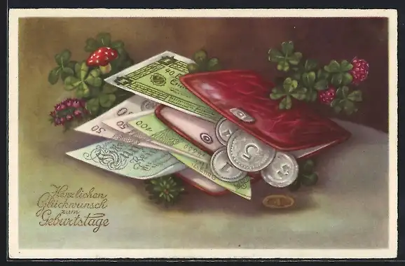 AK Geldbörse mit Münzen und Scheinen, Neujahrsgruss
