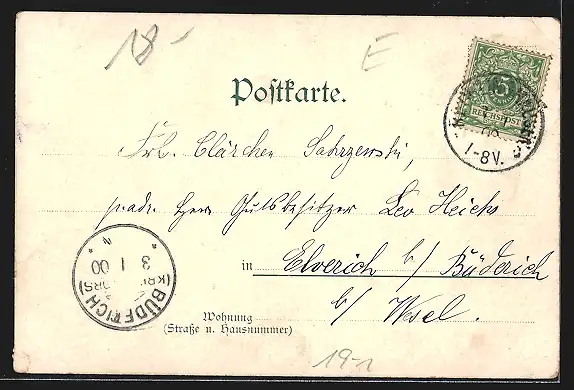 alte Ansichtskarte, gelaufen 1900, Eckknick oben li., Eckknick u. Einriss unten re., guter Zustand