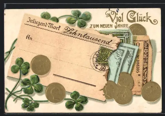 AK Geldmünzen und Scheine inmitten von Kleeblättern, Neujahrsgruss