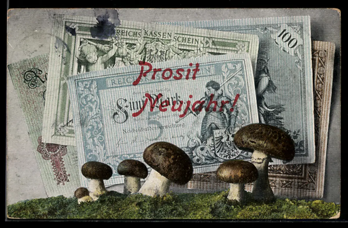 AK Geldscheine mit Champignons, Neujahrsgruss