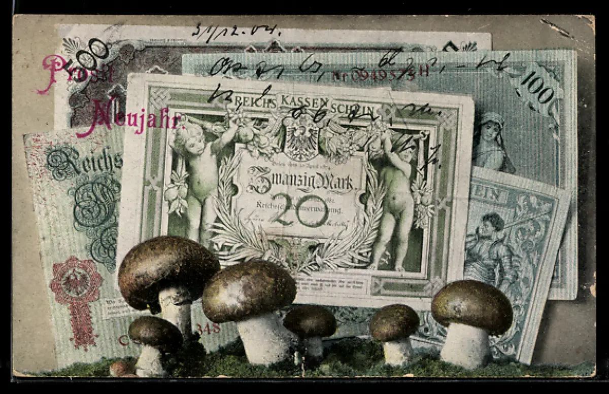 AK Geldscheine mit Champignons, Neujahrsgruss