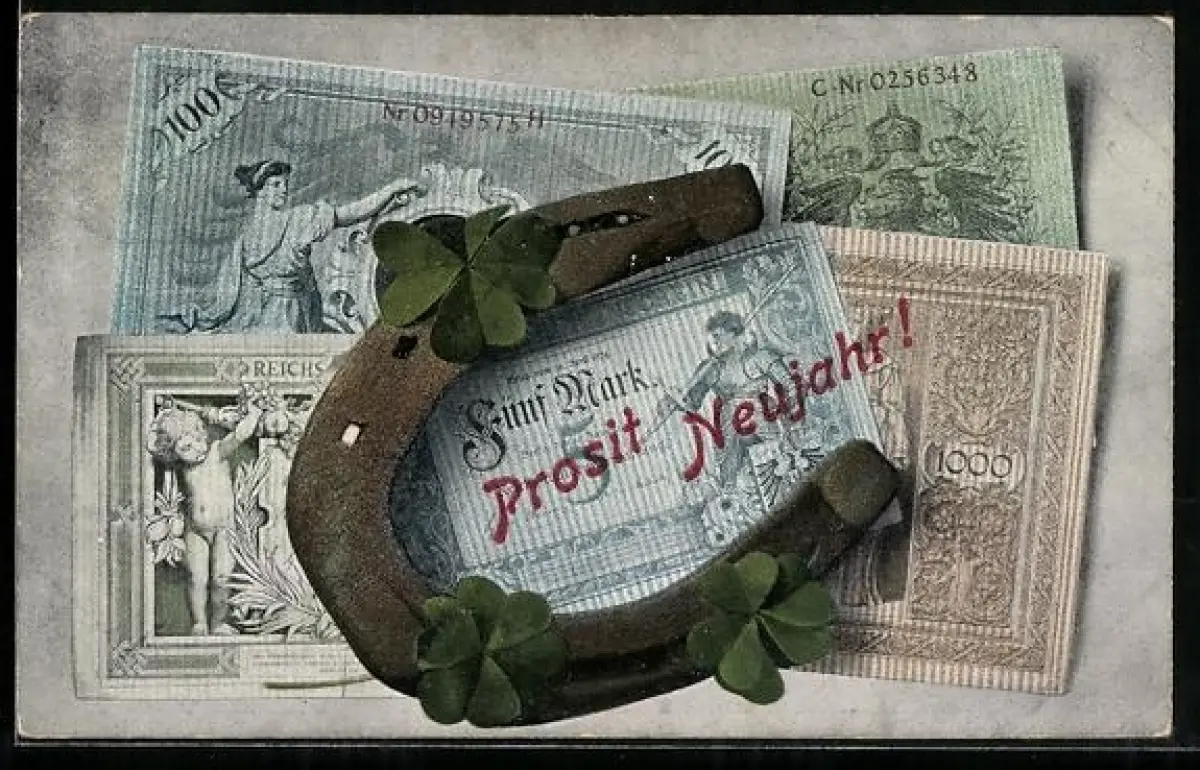 AK Geldscheine mit einem Hufeisen, Neujahrsgruss
