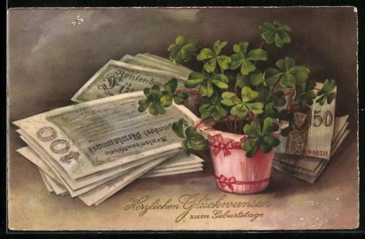 AK Geldscheine und Klee im Blumentopf, Glückwunsch zum Geburtstag