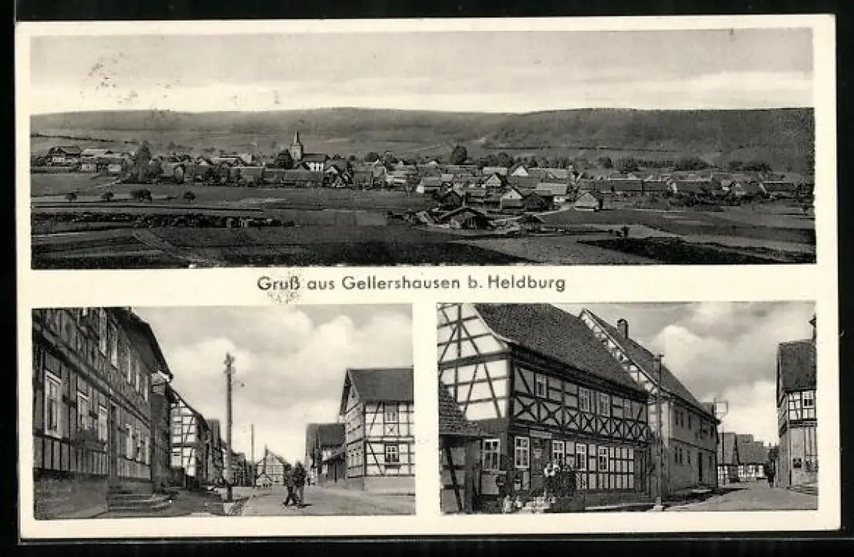 AK Gellershausen b. Heldburg, Gasthaus im Fachwerkbau, Ortsansicht aus der Vogelschau