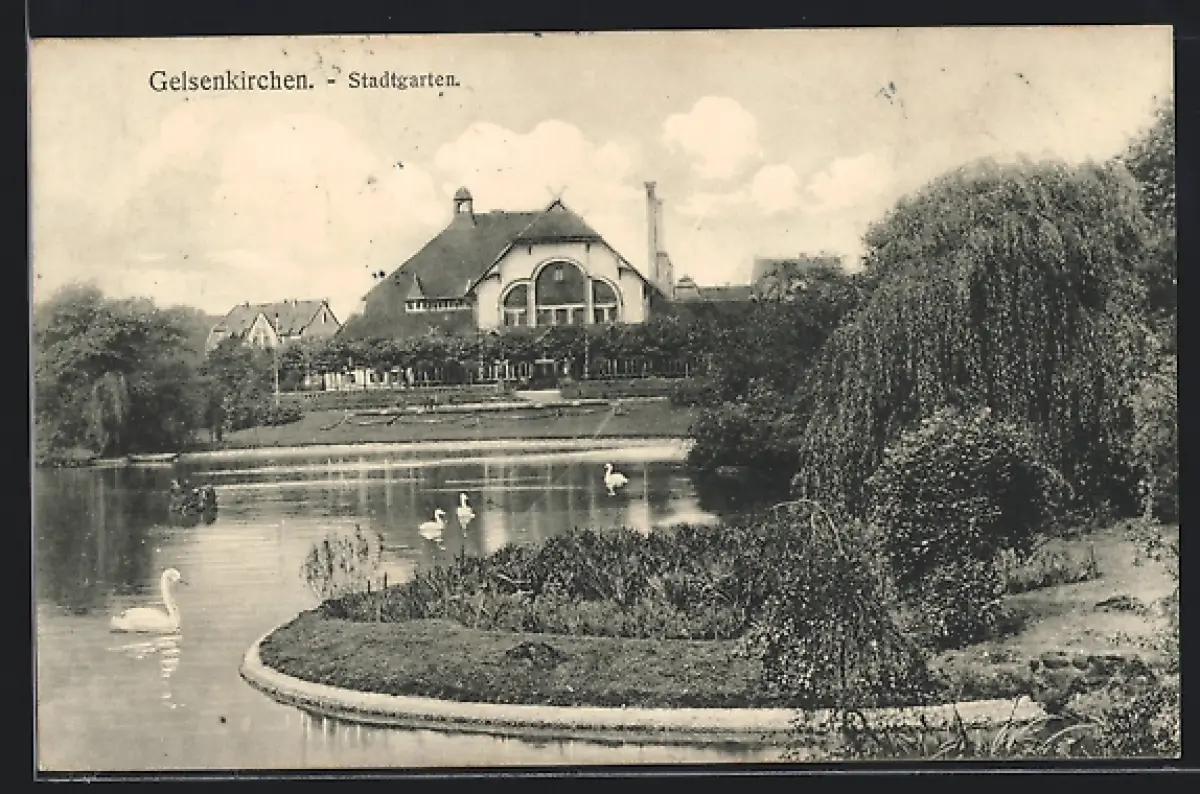 AK Gelsenkirchen, Stadtgarten mit Teich und Schwänen