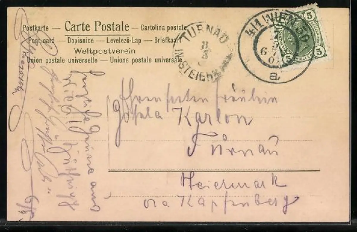 Personenbezogene Daten auf der Rückseite der Karte wurden durch blauen Textmarker unkenntlich gemacht. Die blauen Stellen sind auf die Vorderseite durchgeweicht und wirken sich negativ auf das Postkartenfoto aus