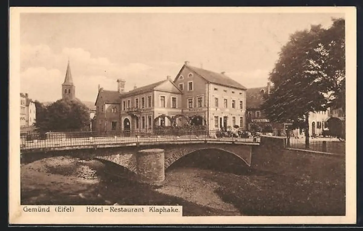 AK Gemünd /Eifel, Hotel-Restaurant Klaphake, Brücke, Kirche