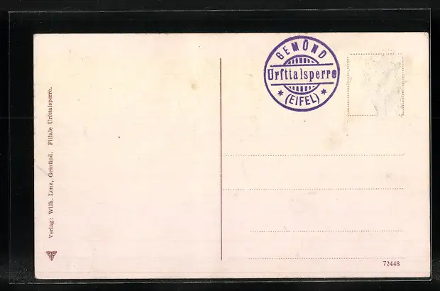 Personenbezogene Daten auf der Rückseite der Karte wurden durch blauen Textmarker unkenntlich gemacht. Die blauen Stellen sind auf die Vorderseite durchgeweicht und wirken sich negativ auf das Postkartenfoto aus