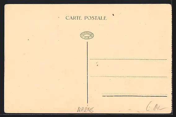 Personenbezogene Daten auf der Rückseite der Karte wurden durch blauen Textmarker unkenntlich gemacht. Die blauen Stellen sind auf die Vorderseite durchgeweicht und wirken sich negativ auf das Postkartenfoto aus