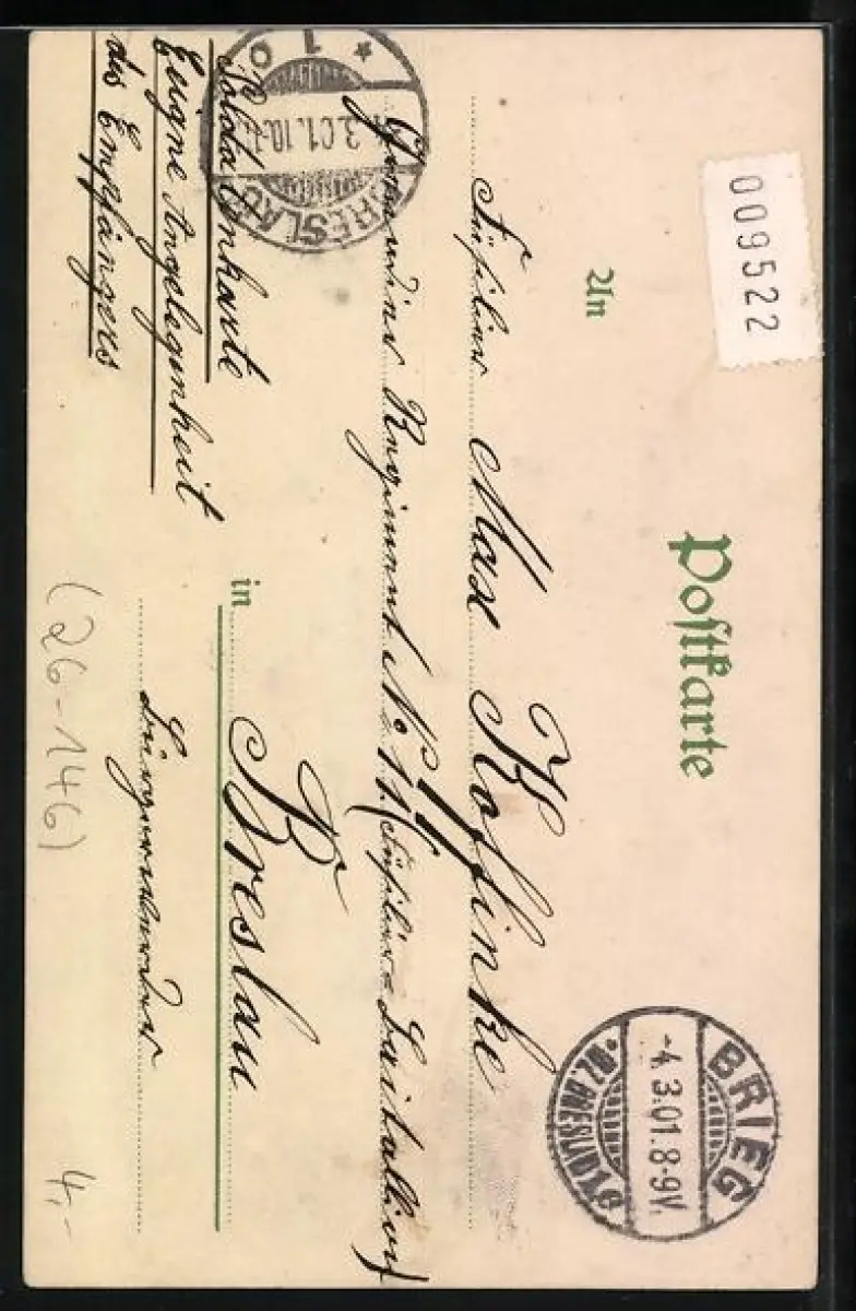 alte Ansichtskarte, gelaufen 1901, rückseitig Klebe- und Papierreste, Bugspur re. oben, guter Zustand