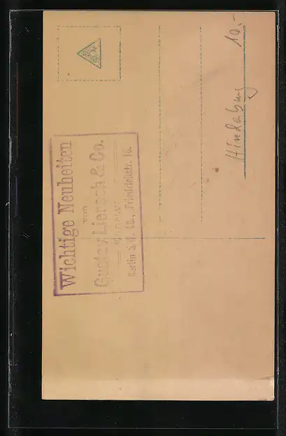 Personenbezogene Daten auf der Rückseite der Karte wurden durch blauen Textmarker unkenntlich gemacht. Die blauen Stellen sind auf die Vorderseite durchgeweicht und wirken sich negativ auf das Postkartenfoto aus