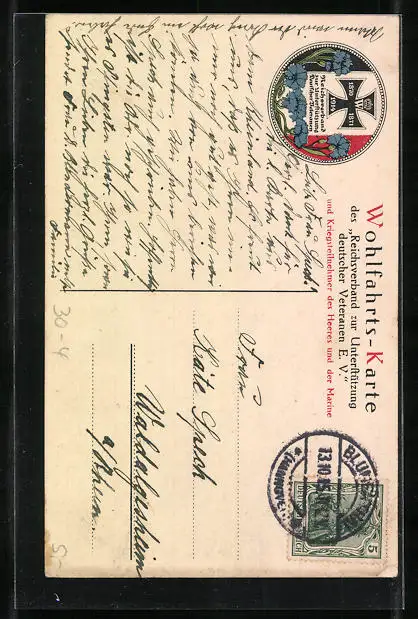 Personenbezogene Daten auf der Rückseite der Karte wurden durch blauen Textmarker unkenntlich gemacht. Die blauen Stellen sind auf die Vorderseite durchgeweicht und wirken sich negativ auf das Postkartenfoto aus
