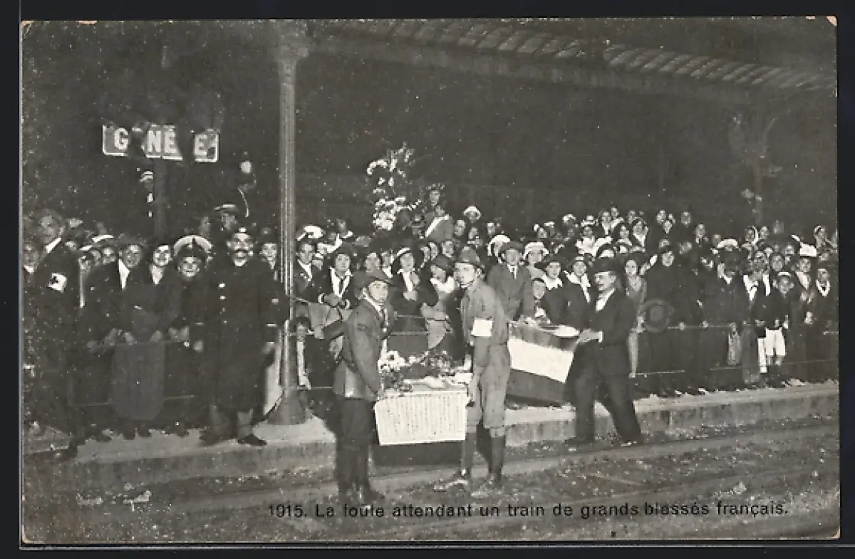AK Geneve, Bahnhof, Menschen warten auf Zug mit schwerverwundeten Franzosen