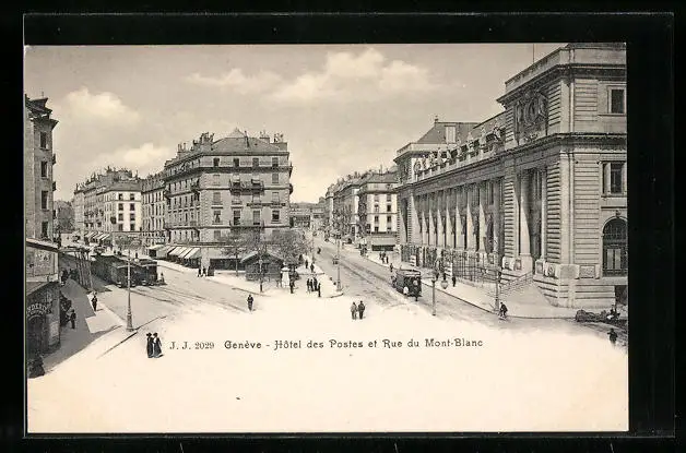 AK Genève, Hôtel des Postes et Rue du Mt-Blanc, Strassenbahn